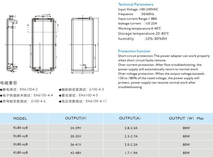過流保護:過流故障排除后,電源將自動恢復正常工作 過壓保護:當輸出電壓超過額定電壓的150~180%時,電源將保護,故障排除后電源能恢復正常工作 輸入電壓:100-240VAC 頻率:50/60Hz 輸入電流:1.88A 漏電電流:<0.25A 工作溫度:0-40℃ 貯藏溫度:-20-80℃ 濕度:10%-80%RH" />